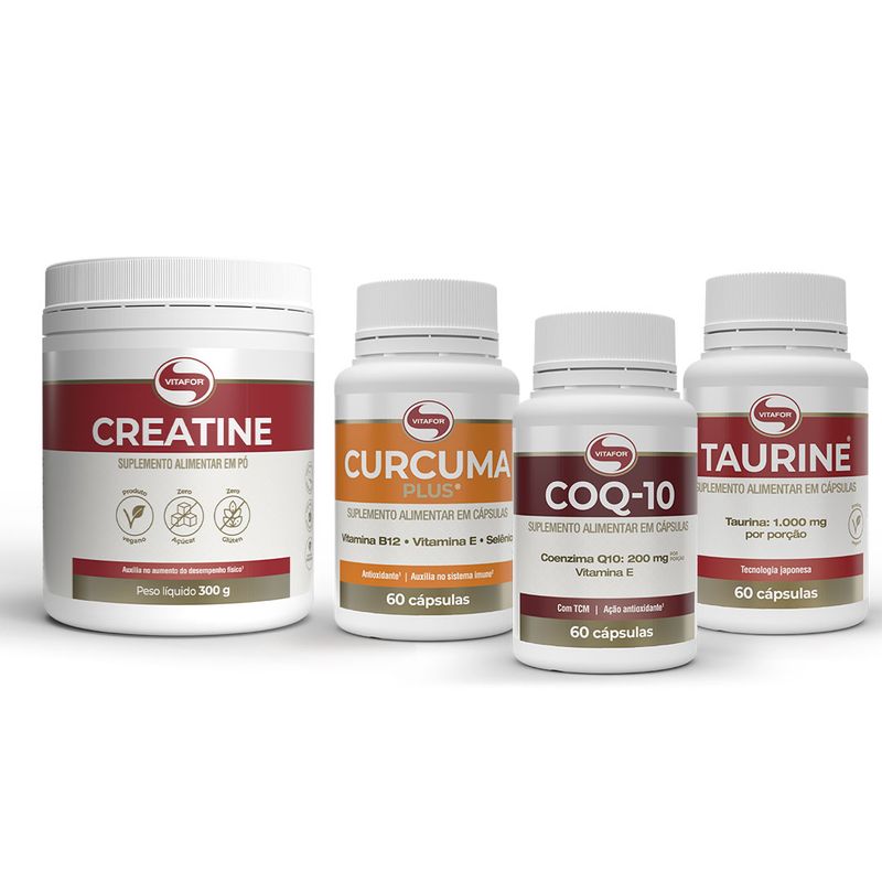 Kit Cognição e longevidade é composto pelos produtos: Creatine - 300g, Curcuma Plus - 60 cap, Taurine - 60 cap e Coenzima Q10 - 60 cap (200mg p/ porção).