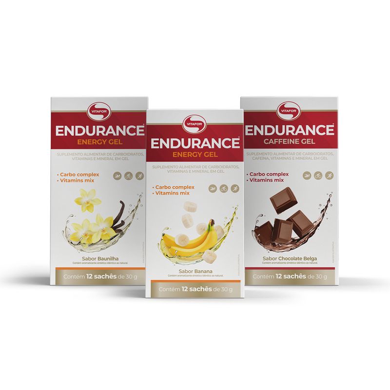 Kit Performance em sachê é composto por: Endurance Energy Gel - 12 sachês 30g Baunilha, Endurance Energy Gel - 12 sachês 30g Banana e Endurance Energy Gel - 12 sachês 30g Chocolate Belga.